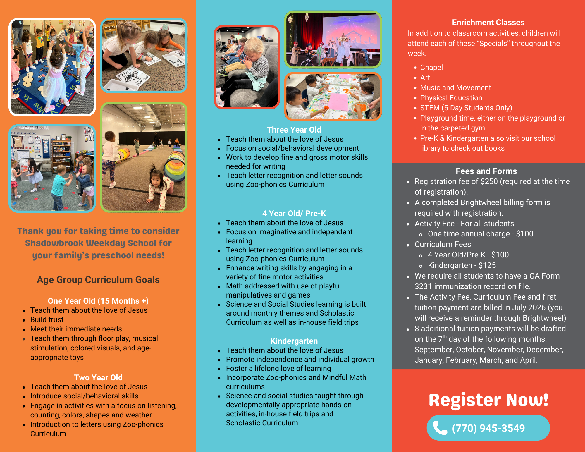 • Registration is currently open for the 2025-2026 school year. If you are interested in enrolling a child, please contact us to set up a tour.